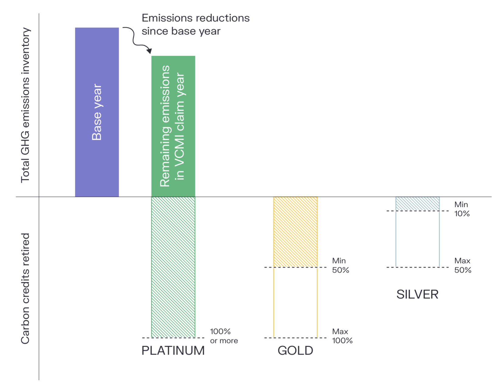 Carbon Integrity Silver, Gold and Platinum Claims, and the respective thresholds that represent the amount of credits retired, proportional to the remaining emissions in the year that a company makes a claim, having reduced emissions in comparison to the base year. Source: VCMI