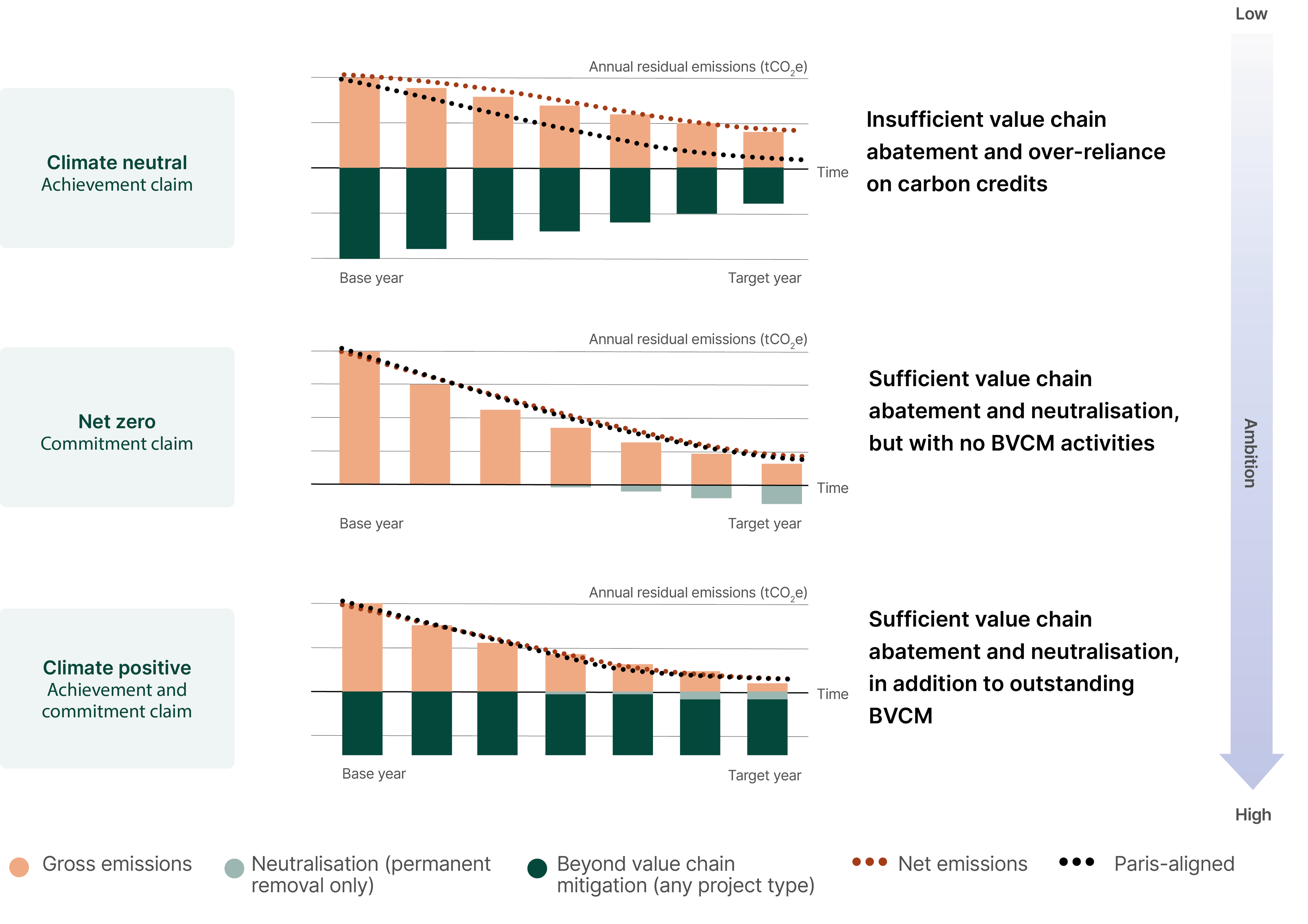 - Climate positive: also known as carbon negative is the idea that a company does more good than harm by supporting carbon projects and buying carbon credits which cover more than their annual emissions. This should be done in addition to stringent value chain reductions. This is the most ambitious pledge a company can make.