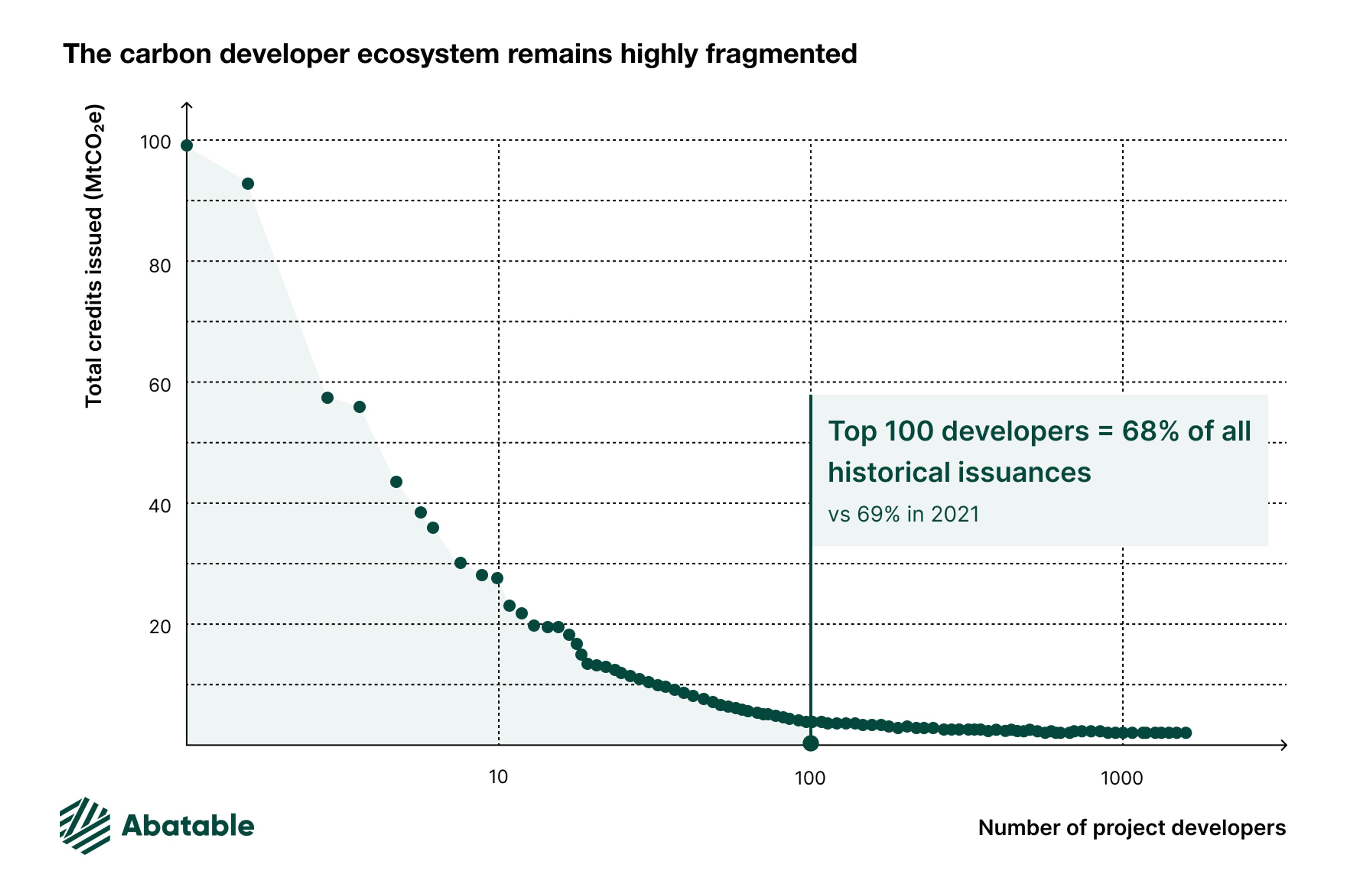 Firstly, the ecosystem has exhibited the first signs of market consolidation, illustrated by the Top 15 developers (across all project types) representing a larger share of historical issuances in 2022.
